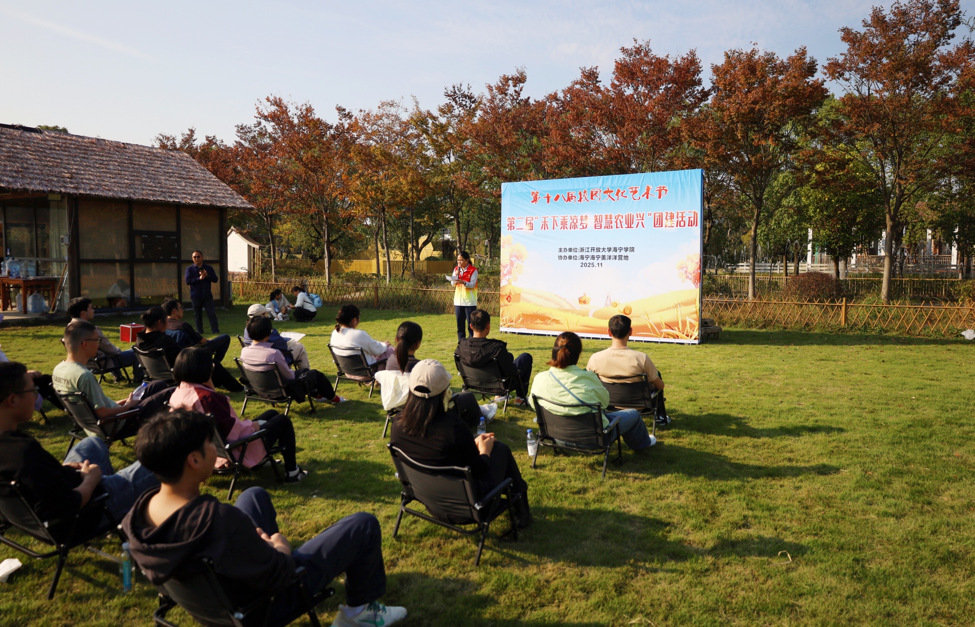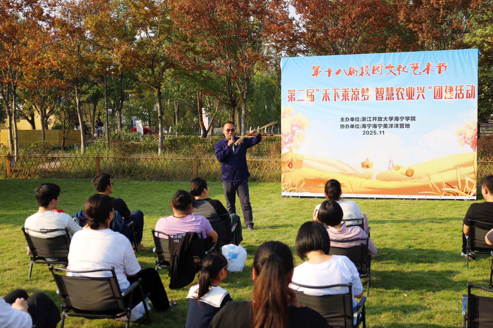 金秋送爽,稻浪翻滚。2025年11月16日下午,浙江开放大学海宁学院在美洋洋营地举办第二届“禾下乘凉梦 智慧农业兴”学生主题团建活动,几十位师生齐聚田野,共赴一场别开生面的劳动教育实践课。