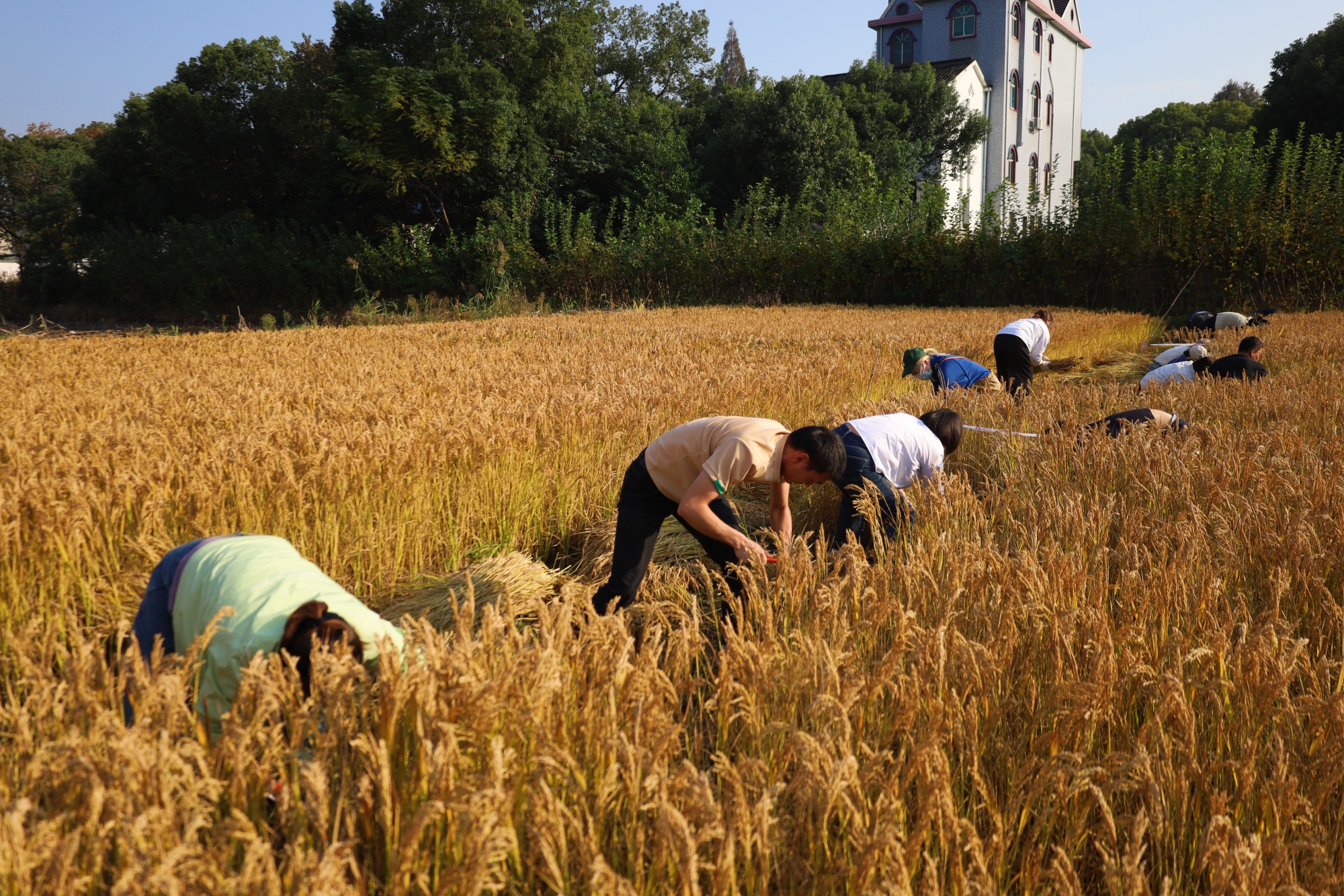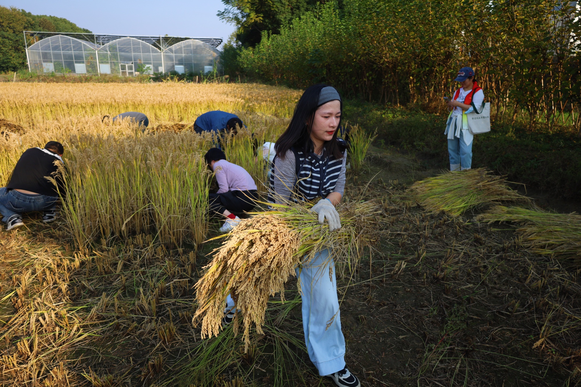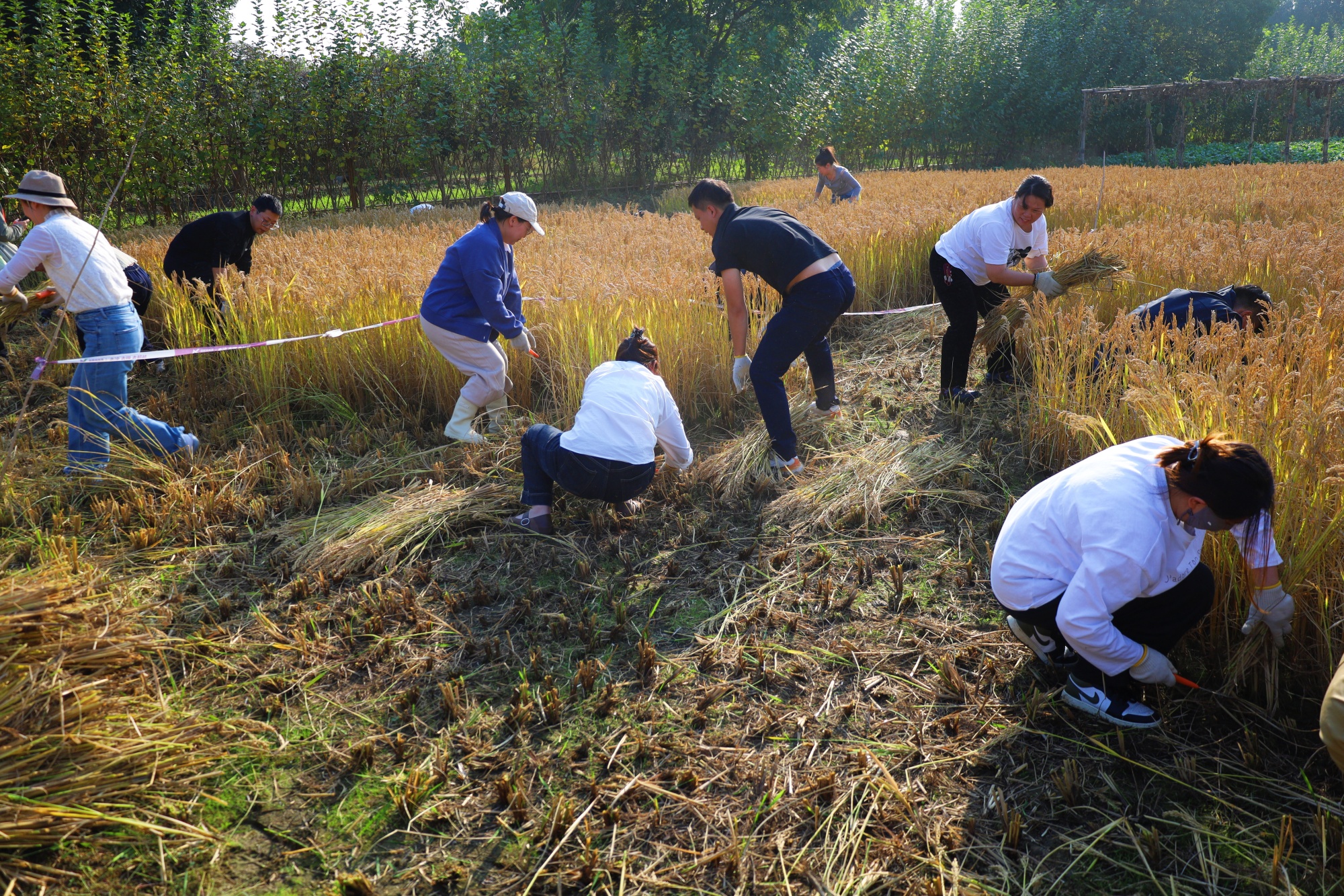 教练向学员们详细说明了割水稻比赛的规则。所有参赛选手通过随机抽签分成6个小组,每个小组将分到同样大小的一块地,最终按照每组割水稻所花时间进行排名。参赛学员迅速戴上手套,手持镰刀奔赴“战场”。随着虞主任一声令下,割稻大赛正式启动。稻田瞬间沸腾——有的小组采用“一字排开”战术同步推进,有的则分工协作,有人割稻、有人捆扎、有人运输。