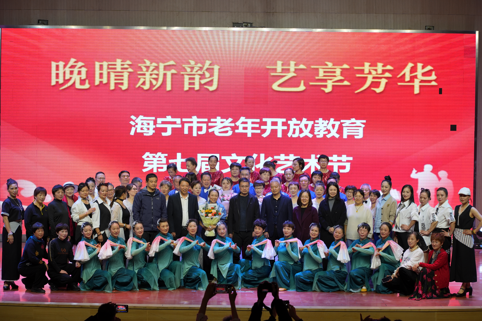 嘉兴开放大学开放教育学院副院长严娟娣、海宁市教育局职成教科科长朱钱锋、海宁市民政局老龄工作和养老服务科科长马森苗、海宁老年大学管理服务中心主任赵晴,以及浙江老年开放大学海宁学院的相关领导出席了本次活动。海宁学院的学员与教师代表及各镇(街道)老年学校、村(社区)老年学堂的师生代表共160余人齐聚现场,共享这场艺术盛会。