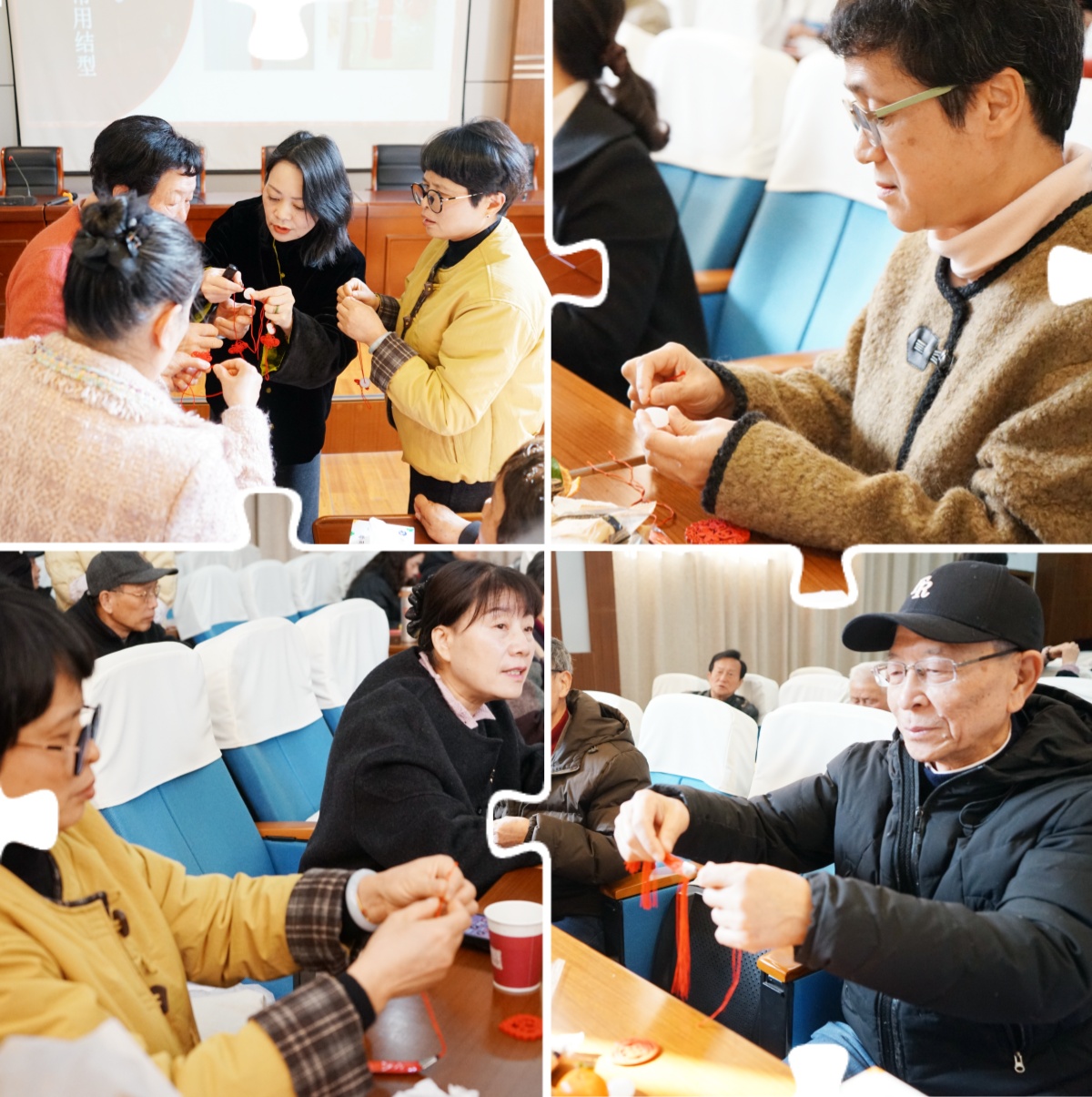 学院还精心安排了一场“绳结艺术”体验课。在非遗爱好者杨丽亚老师的指导下,退休教师们兴致勃勃地学习编织寓意吉祥如意的“平安结”与“福字结”。一根根红绳在指尖穿梭缠绕,不仅唤起了大家对手工技艺的热爱,还在轻松互动中寄托着对新年的美好祝愿。