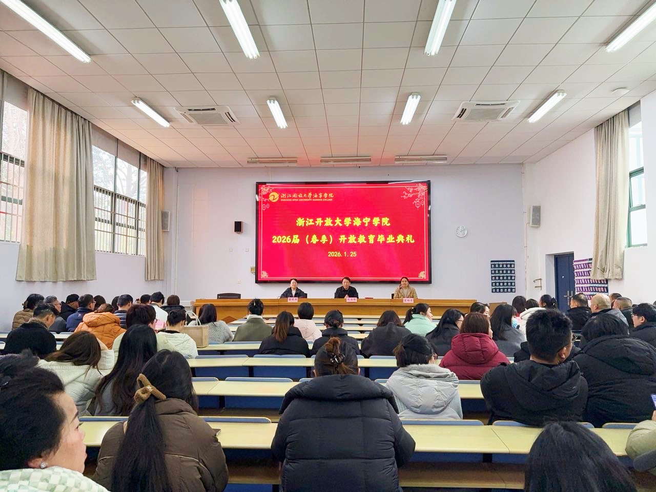 1月25日下午,浙江开放大学海宁学院2026届(春季)毕业典礼于报告厅举行。学院党支部书记、院长陈海锋,副院长董晓燕出席典礼,与1000余名国家开放大学毕业生共同见证这一庄严而温馨的时刻,在师友和同窗的祝福下,毕业生们为两年半的求学时光画上了圆满句号。