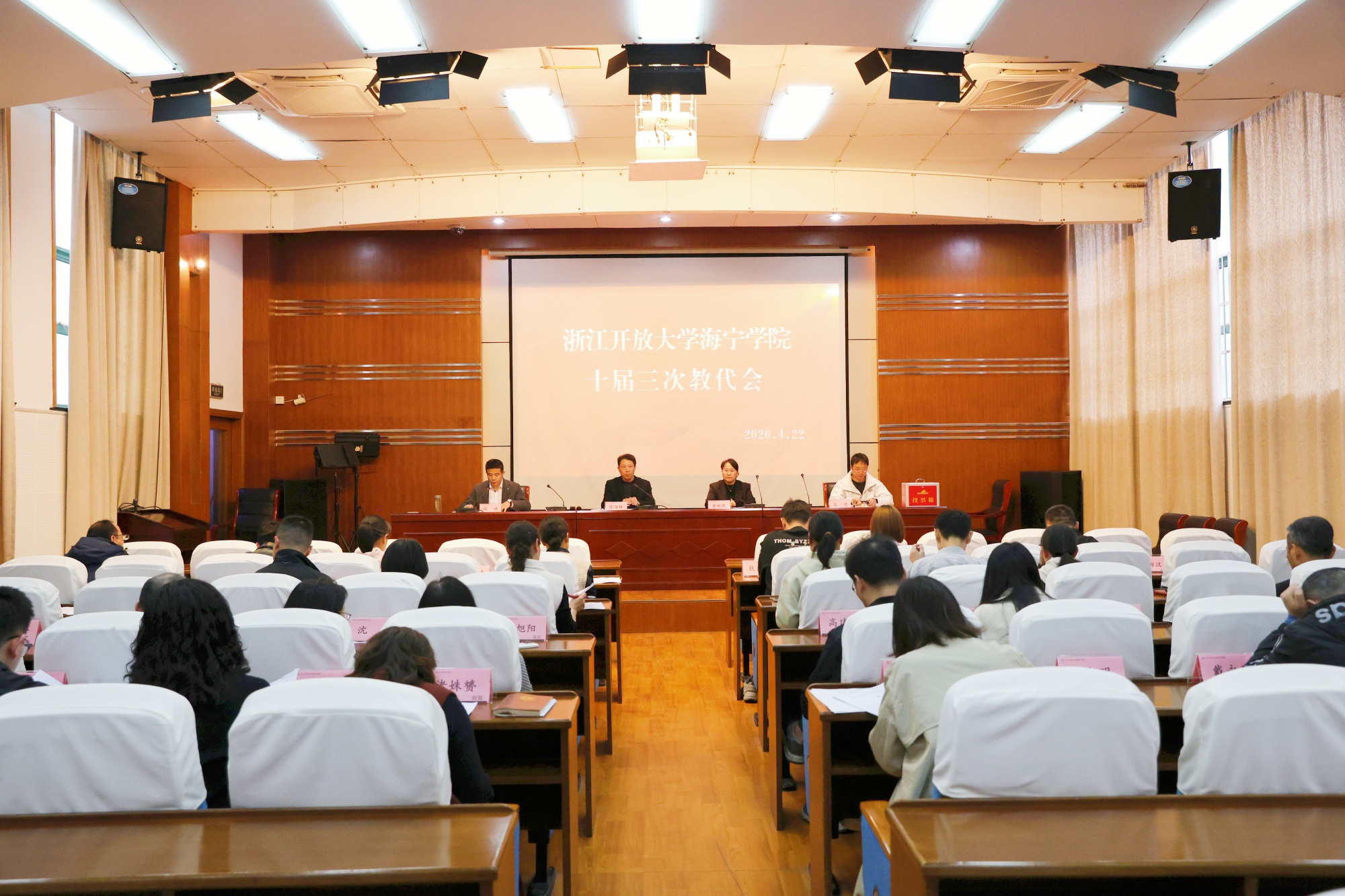 四月芳菲,春意盎然。4月22日下午,浙江开放大学海宁学院在报告厅隆重举行第十届教职工代表大会第三次会议。学院党支部书记、院长陈海锋,副院长董晓燕、倪斌及全体教职工代表齐聚一堂,围绕“聚力转型促发展 优化分配增效能”的中心议题,共商发展大计,擘画未来蓝图。